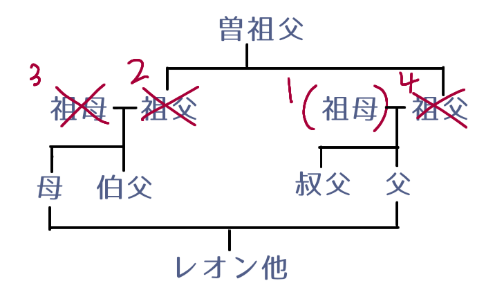 ・両親の結婚時点で、×は故人、()は失踪で、番号順にいなくなる。曽祖父は病床、曾祖母はもっと前に没。